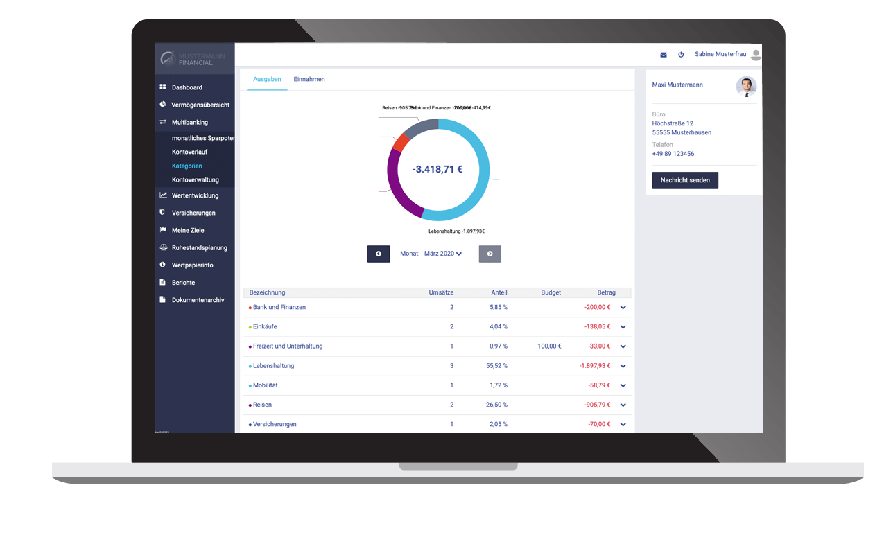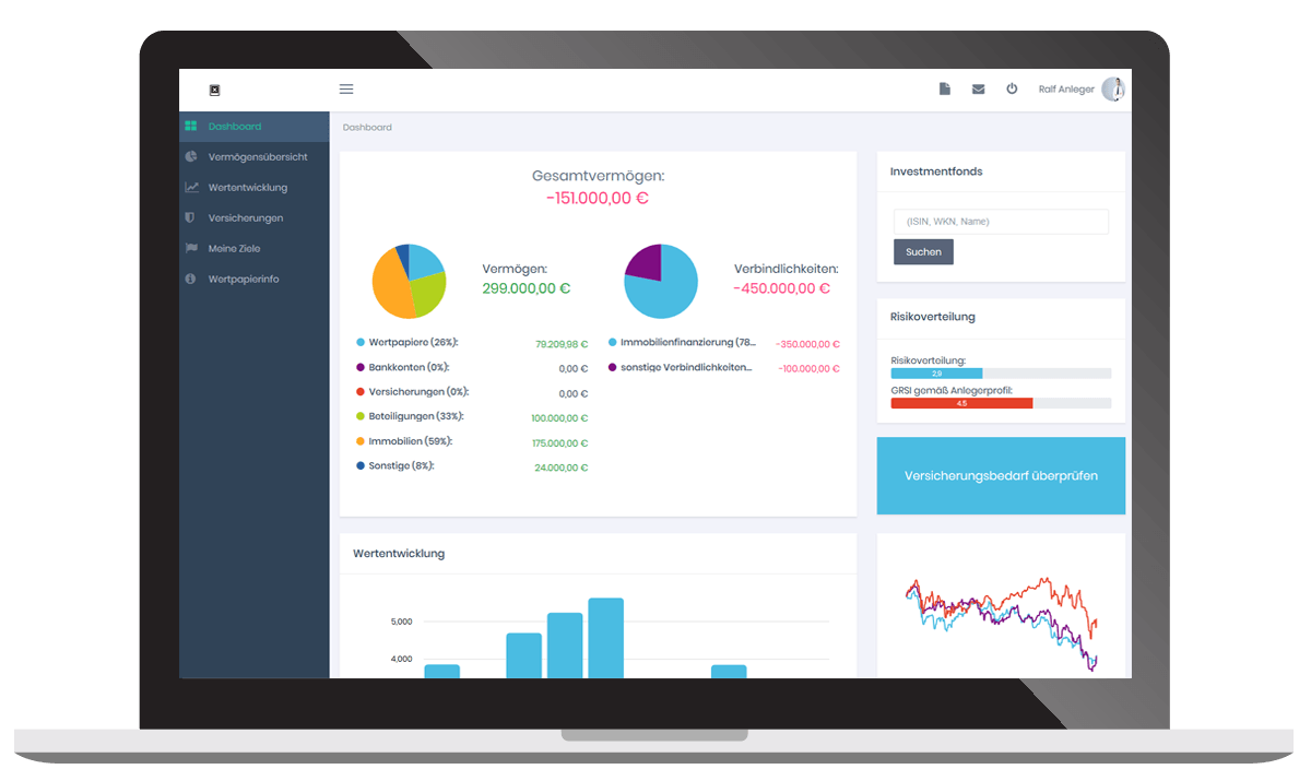 Finance Home haben Sie Ihr gesamtes Vermögen stets im Blick. Sie können mit Ihrem Smartphone alle Transaktionen verfolgen, das eigene Finanzwissen erweitern und unterschiedliche Anlage-Klassen miteinander vergleichen. Auch der Einblick auf die Bank- & Kreditkartenkonten steht Ihnen in Finance Home jederzeit zur Verfügung. Eigene Dokumente im Dokumentensafe hinterlegen, oder bequem von unterwegs Investmentfonds kaufen und verkaufen ist kein Problem mit Finance Home. Zudem können Sie alle Versicherungen einsehen und über unsere gesicherte API Schnittstelle, haben Sie ebenfalls den Zugriff auf ihre extern geführten Depots und Bankkonten. Somit ist eine Gesamtübersicht nach einmaligem Hinzufügen der Konten problemlos möglich.